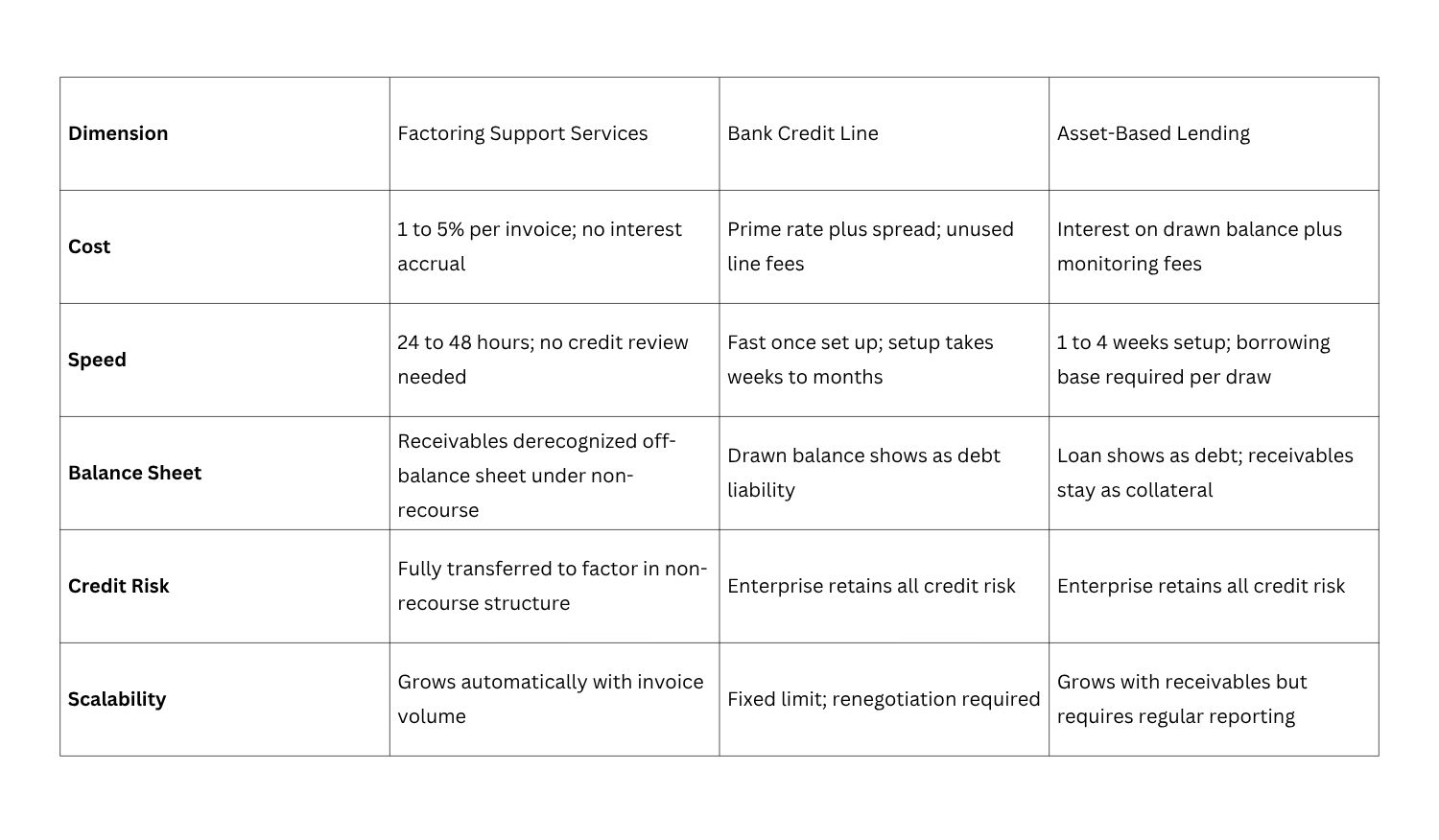 According to Mordor Intelligence, the global factoring market will reach USD 6.30 trillion by 2031, growing from USD 4.68 trillion in 2026. That trajectory signals a decisive shift in how enterprises view receivables financing. Before committing to a structure, finance leaders should compare the available instruments on the dimensions that matter most.